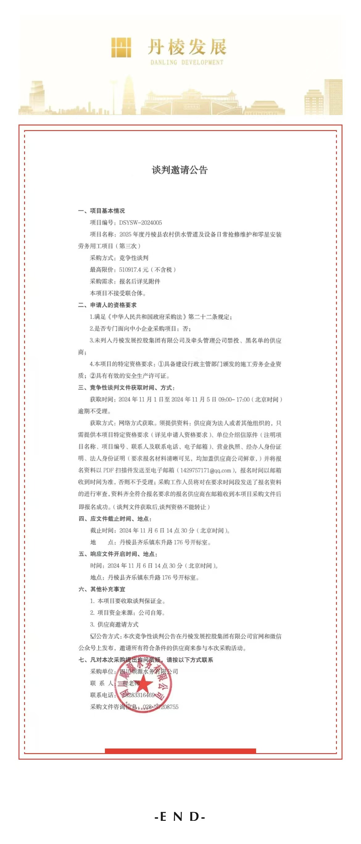 2025年度丹棱縣農村供水管道及設備日常搶修維護和零星安裝勞務(wù)用工項目(第三次)談判邀請公告