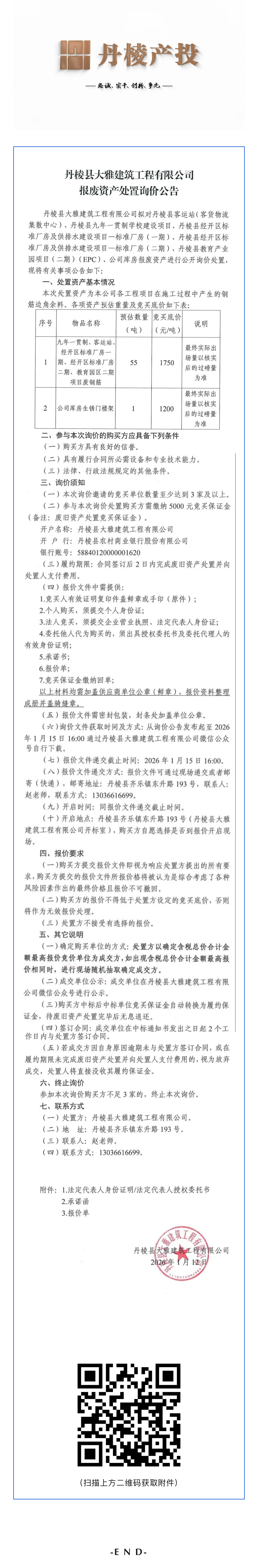 丹棱縣大雅建筑工程有限公司報(bào)廢資產(chǎn)處置詢價(jià)公告