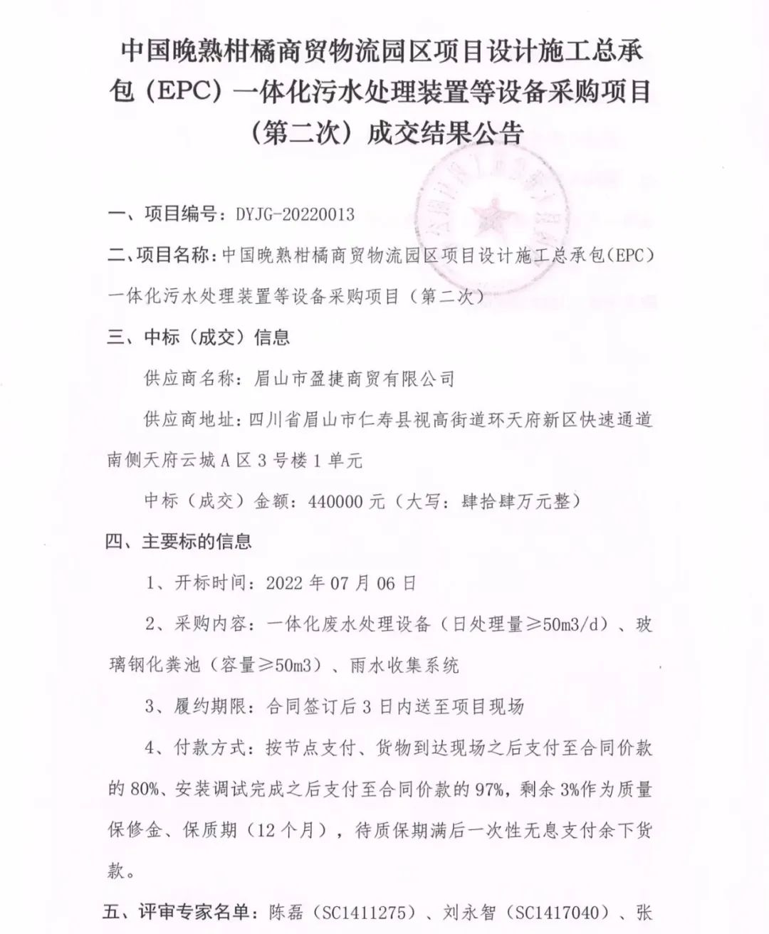 中國晚熟柑橘商貿物流園區項目設計施工總承包(EPC)一體化污水處理裝置等設備采購項目(第二次)成交結果公告