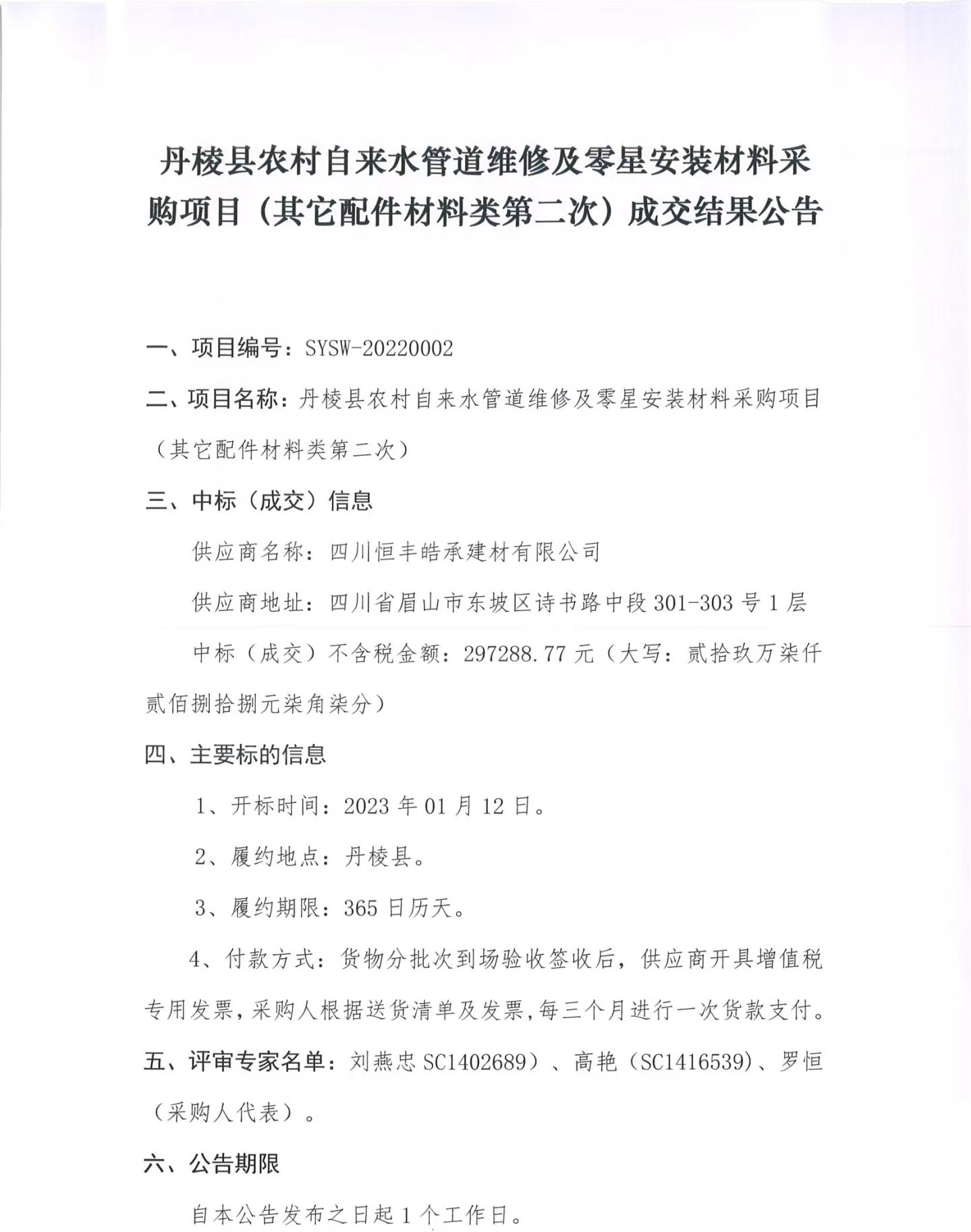 丹棱縣農村自來(lái)水管道維修及零星安裝材料采購項目(其它配件材料類(lèi)第二次) 成交結果公告