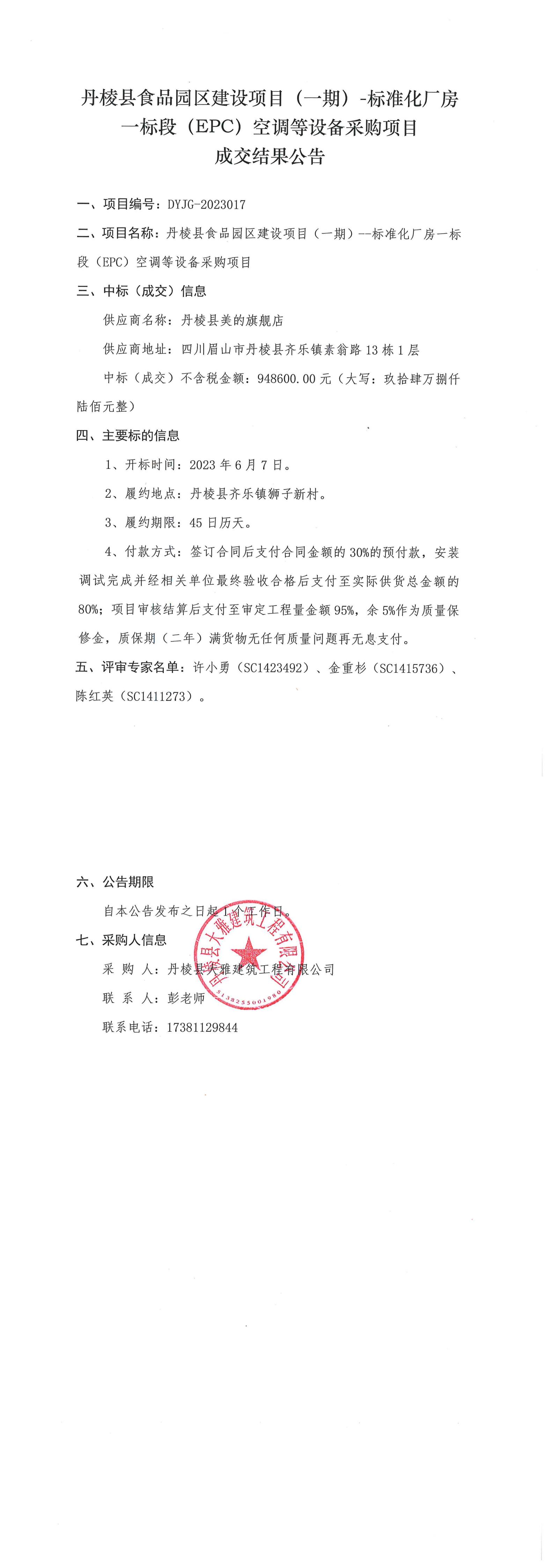 丹棱縣食品園區建設項目(一期)-標準化廠(chǎng)房一標段(EPC)空調等設備采購項目成交結果公告