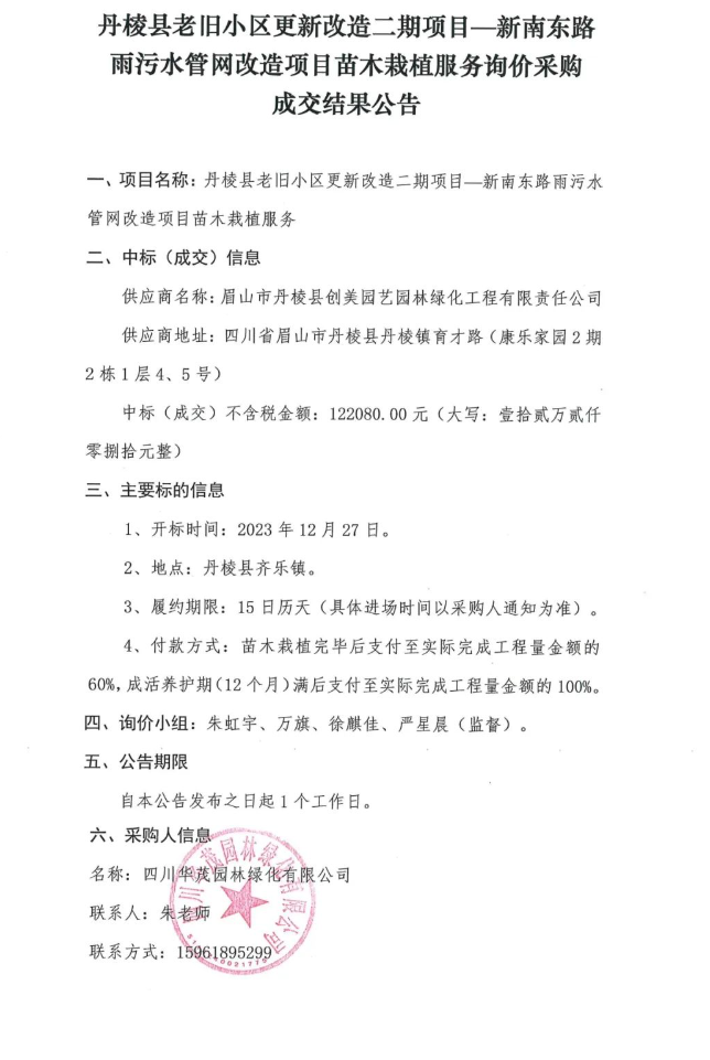 丹棱縣老舊小區更新改造二期項目——新南東路雨污水管網(wǎng)改造項目苗木栽植服務(wù)詢(xún)價(jià)采購成交結果公告