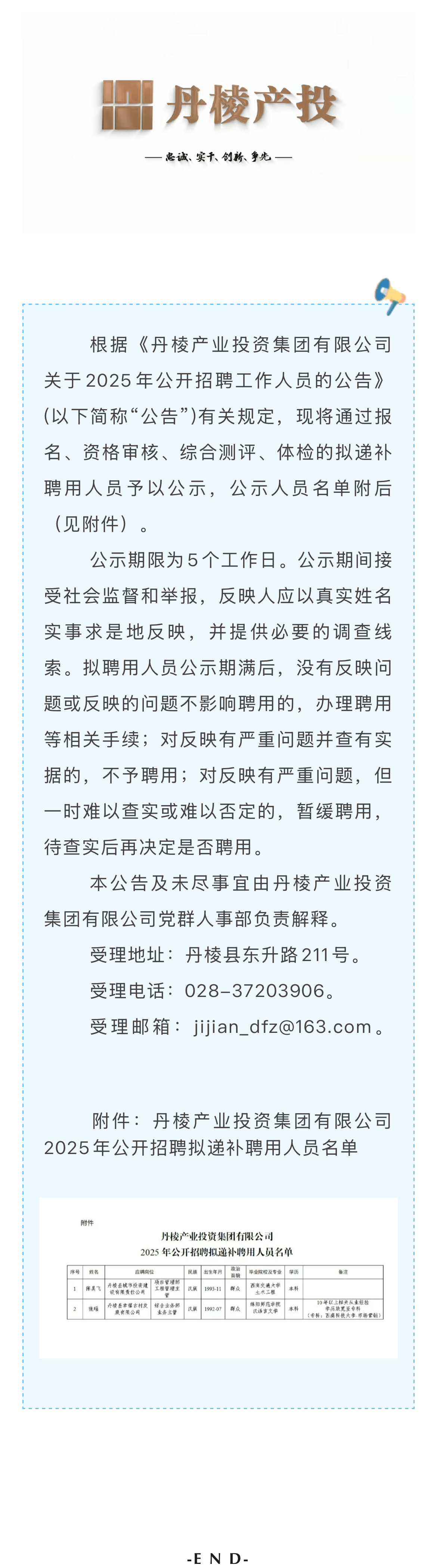 丹棱產(chǎn)業(yè)投資集團(tuán)有限公司關(guān)于2025年公開(kāi)招聘擬遞補(bǔ)聘用人員的公示